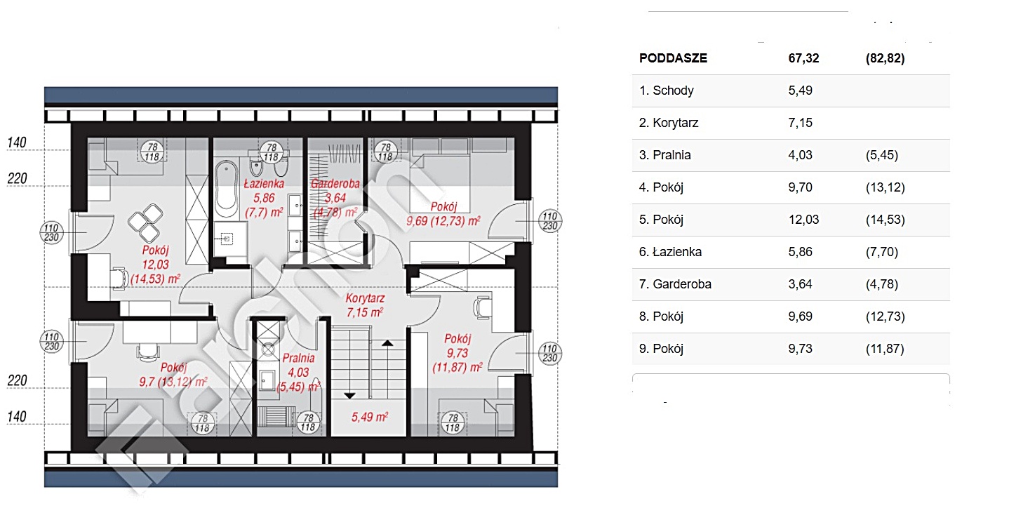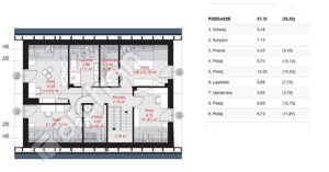 Poddasze: sypialnia główna z garderobą, trzy pokoje dla dzieci, łazienka i pralnia.