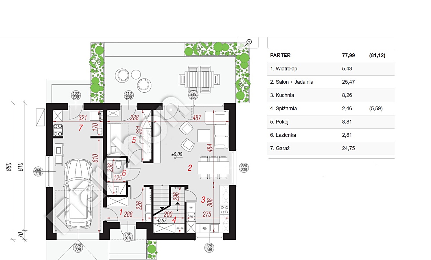 Parter: przestronny salon z jadalnią i wyjściem na taras, kuchnia ze spiżarnią, gabinet z wyjściem do ogrodu, łazienka, garaż i kotłownia.